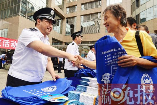 [摘要]國傢反恐辦首次編制出版《公民防范恐怖襲擊手冊》,公安部高層楊煥寧、陳智敏、傅政華、李偉等出席首發儀式,並向市民發放手冊。遼寧、上海、河南、廣東、新疆等地同步發放。 公安部副部長、北京市委常委、公安局長傅政華給市民發放《防恐手冊》,並與市民握手交談 攝/法制晚報記者 郭謙 特警向市民展示防恐警用裝備 攝/法制晚報記者 郭謙 特警在現場手把手教女市民如何與手持菜刀的歹徒周旋 攝/法制晚報記者 郭謙