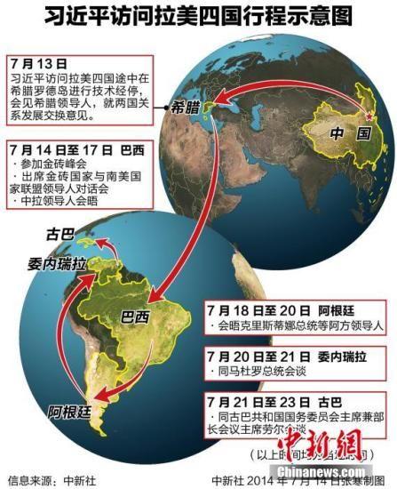 | 習近平於當地時間7月14日出席金磚國傢領導人第六次會晤,並訪問巴西、阿根廷、委內瑞拉、古巴。中新社發 張寒作 中新網福塔萊薩7月14日電 (記者 張朔)當地時間14日下午2時許,中國國傢主席習近平乘專機抵達位於巴西東北部、因世界杯主辦地而揚名的港口城市福塔萊薩。 應巴西聯邦共和國總統羅塞芙邀請,習近平將出席金磚國傢領導人第六次會晤、對巴西進行首次國事訪問並出席中國-拉美和加勒比國傢領導人會晤。之後,習近平還將對阿根廷、委內瑞拉和古巴進行國事訪問。 巴西國土面積850多萬平方公裡,位於南美洲東南部,是西半球最大的發展中國傢。中巴1974年8月15日建交。1993年,巴西在發展中國傢裡率先同中國建立戰略夥伴關系,並於2012年提升為全面戰略夥伴。中巴兩國高層交往頻繁,在國際事務中合作密切,在文化領域交流活躍,雙邊經貿關系也取得長足發展。目前,巴西是中國第九大貿易夥伴和拉美地區最大貿易夥伴,中國是巴西第一大貿易夥伴、出口對象國和進口來源國。 訪巴期間,習近平將同羅塞芙總統舉行會談,會見巴西參、眾議長並在巴西國會發表演講。雙方將簽署貿易、投資、金融、基礎設施、科技、教育等領域一系列合作文件。 習近平此訪適逢中巴建交40周年,是東西半球兩個最大的發展中國傢一次承前啟後、繼往開來的握手。巴方近日表示,這次訪問是“一件非常值得期待的大事”,希望通過此訪全面推動兩國合作取得新的成果。 而此次在巴西舉行的金磚國傢領導人第六次會晤,是金磚國傢領導人第二輪會晤的首場,同樣具有承前啟後的重要意義。 中、俄、巴、印、南五國領導人將圍繞“實現包容性增長的可持續解決方案”主題,就金磚國傢合作及其他共同關心的國際和地區問題深入交換看法,會後將發表《福塔萊薩宣言》。金磚國傢領導人還將同南美國傢領導人舉行對話會,並會見金磚國傢工商理事會代表。 中方希望,本次會晤對外傳遞出金磚國傢團結、合作、包容、共贏的信號,重點在以下四個方面取得積極成果:一是總結合作經驗,規劃未來合作願景;二是將金磚國傢打造成就國際政治經濟領域重大問題進行全方位協調的機制;三是建設更緊密的經濟夥伴關系,推動各領域務實合作取得更大進展;四是加強同南美國傢的對話與合作。